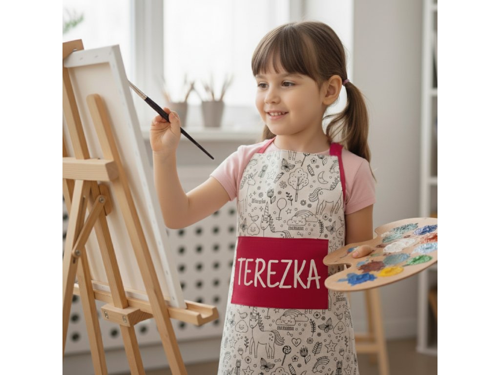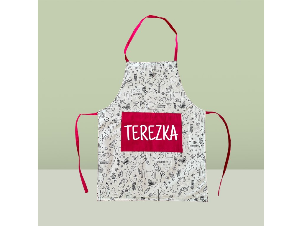 Dětská zástěra ze 100% bavlny se jménem na přání a motivem k domalování. Ručně šitá v Podkrkonoší, ideální na vaření, tvoření i školkové aktivity. Praktická kapsa, dvě barevné varianty, česká ruční výroba.