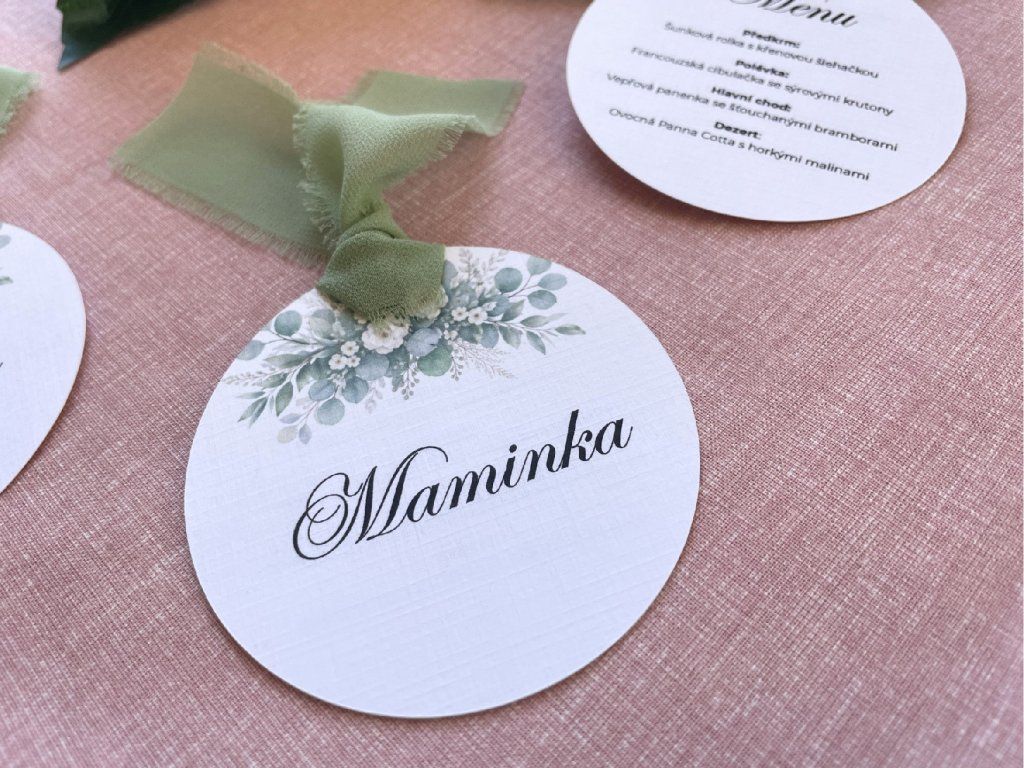 ✅ Balení: 2 kulaté kartičky (jmenovka, menu) spojené stuhou
