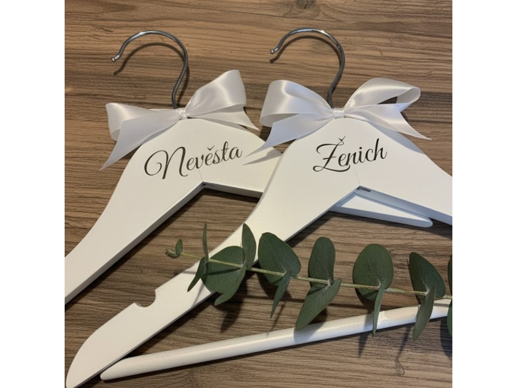 Elegantní bílá svatební ramínka ze dřeva s nápisem Ženich a Nevěsta. Krásný doplněk pro svatební focení i praktické využití. Možnost vlastního nápisu, jmen či data svatby – vytvořte si osobní detail, který zůstane jako vzpomínka na váš den.