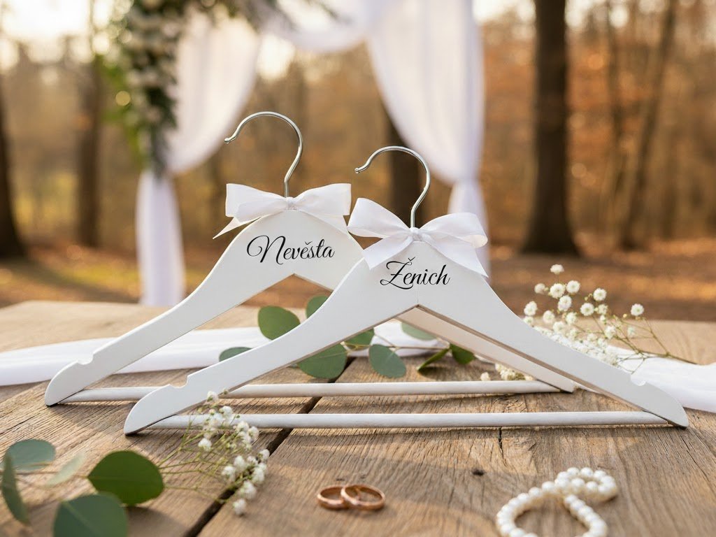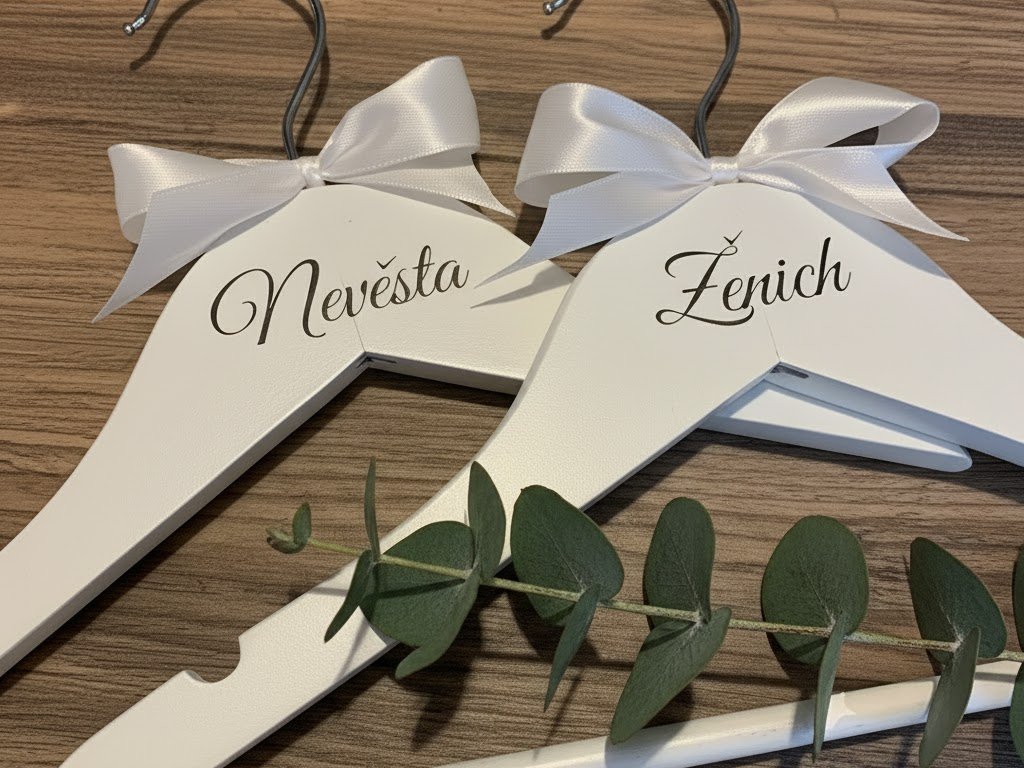Svatební ramínka jsou detail, který dokáže zkrášlit přípravy i fotografie z vašeho dne. Elegantní bílá dřevěná ramínka s vinylovým nápisem Ženich a Nevěsta potěší svým čistým vzhledem a osobním dotekem. Jsou ideální pro svatební šaty i oblek a díky možnosti vlastního potisku se stanou nezaměnitelnou součástí vašeho svatebního dne.